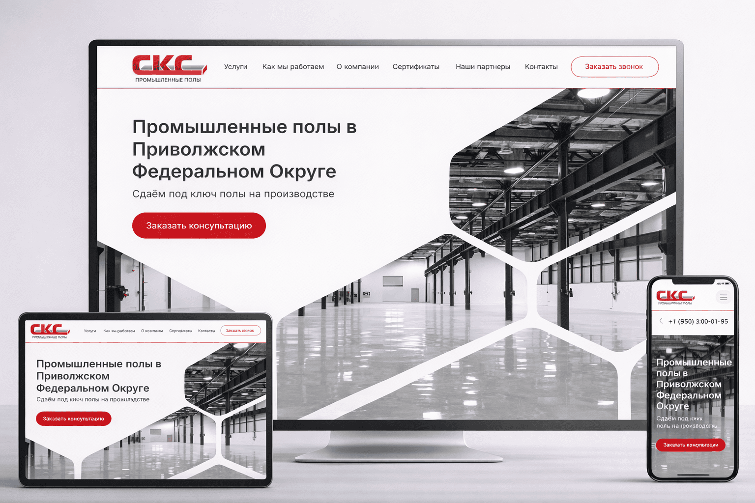 Стартовая композиция сайта для строительства полов Sks-prompol.ru выстроена как инженерный чертеж, переведенный на язык цифровой эстетики: чистые плоскости, отражающий бетон, геометрия перекрытий. Компания-разработчик дизайна — РОСТСАЙТ. Визуальный акцент сразу уходит в глубину пространства, создавая ощущение масштаба и технологического размаха.